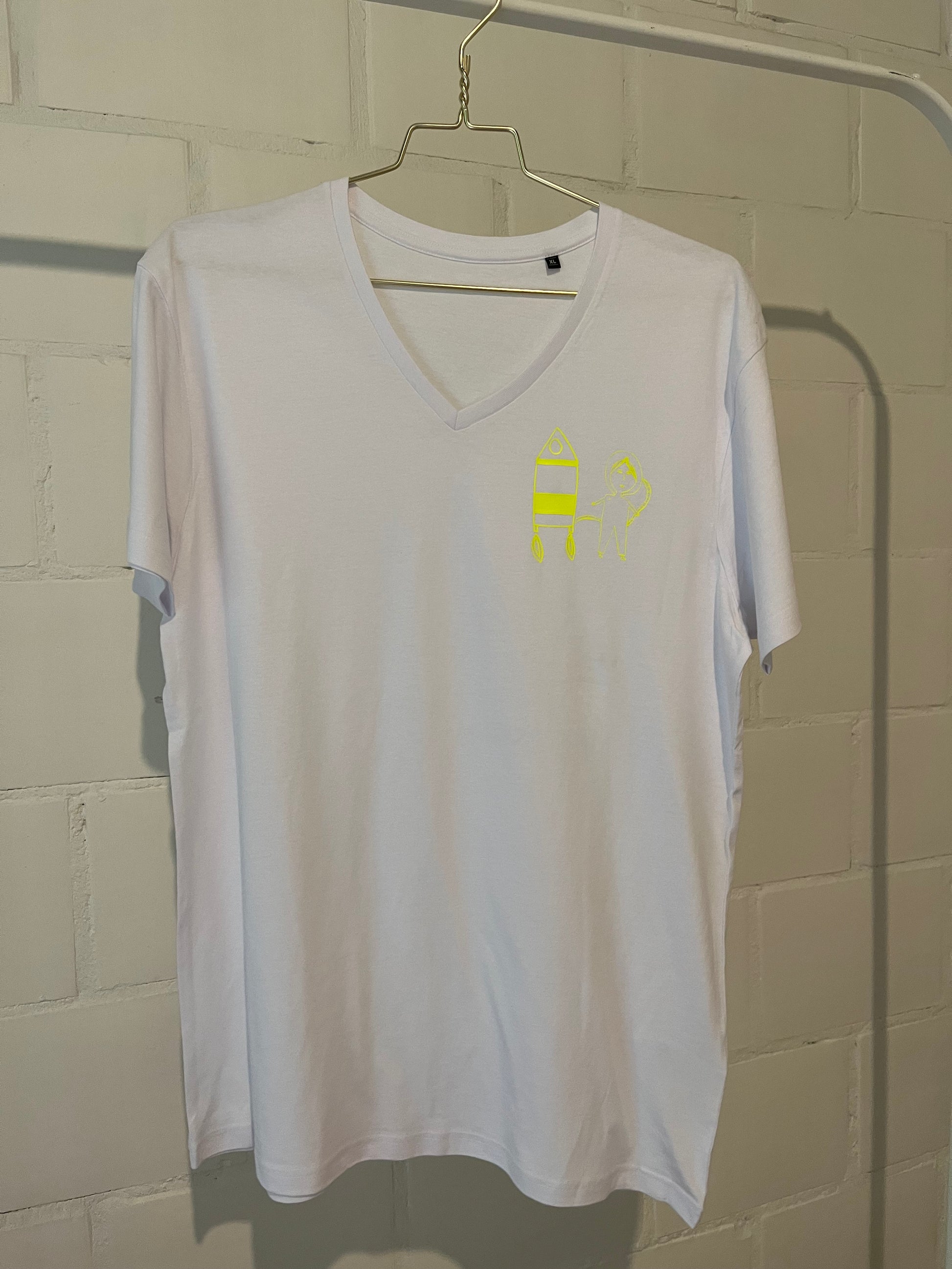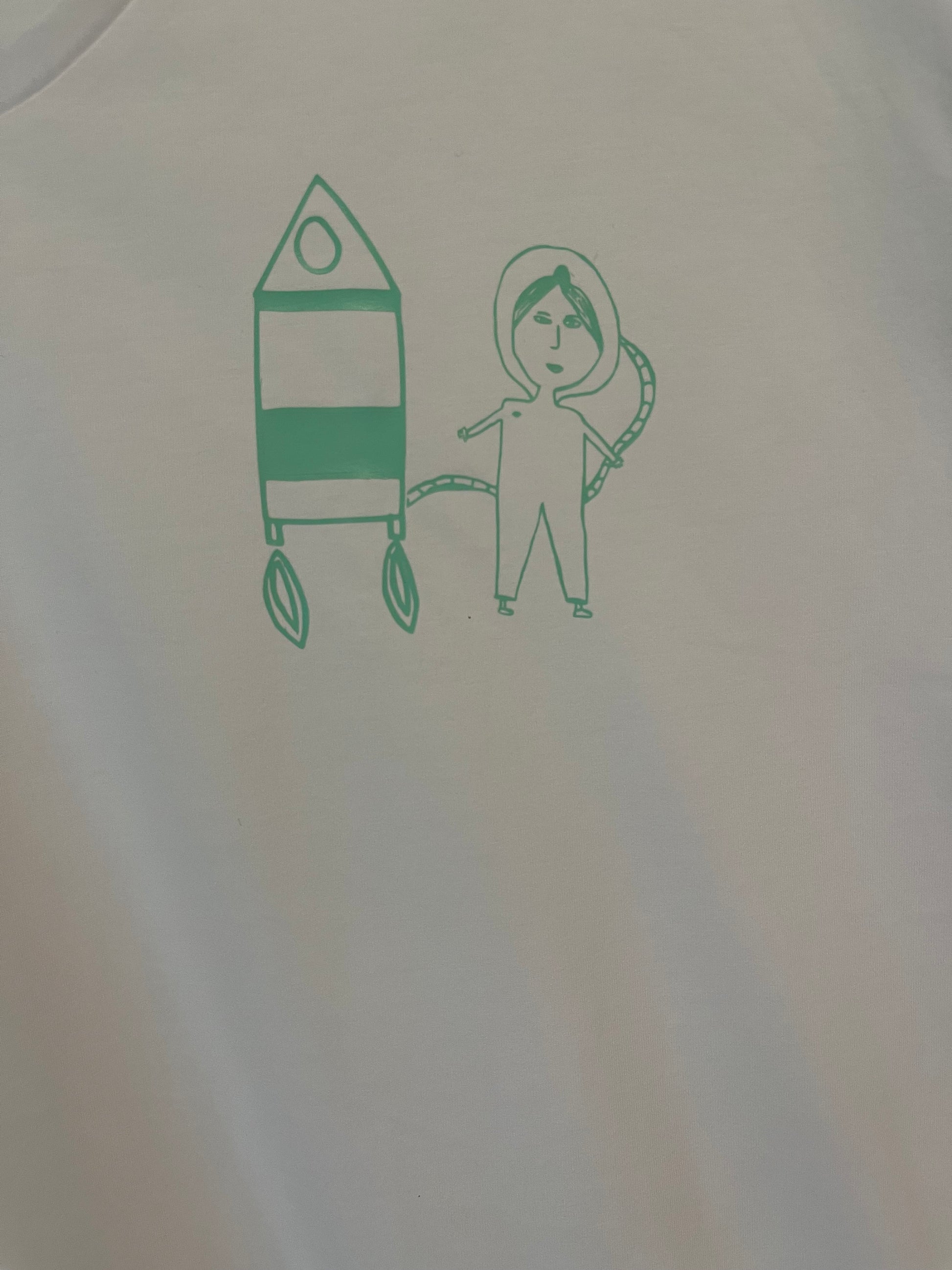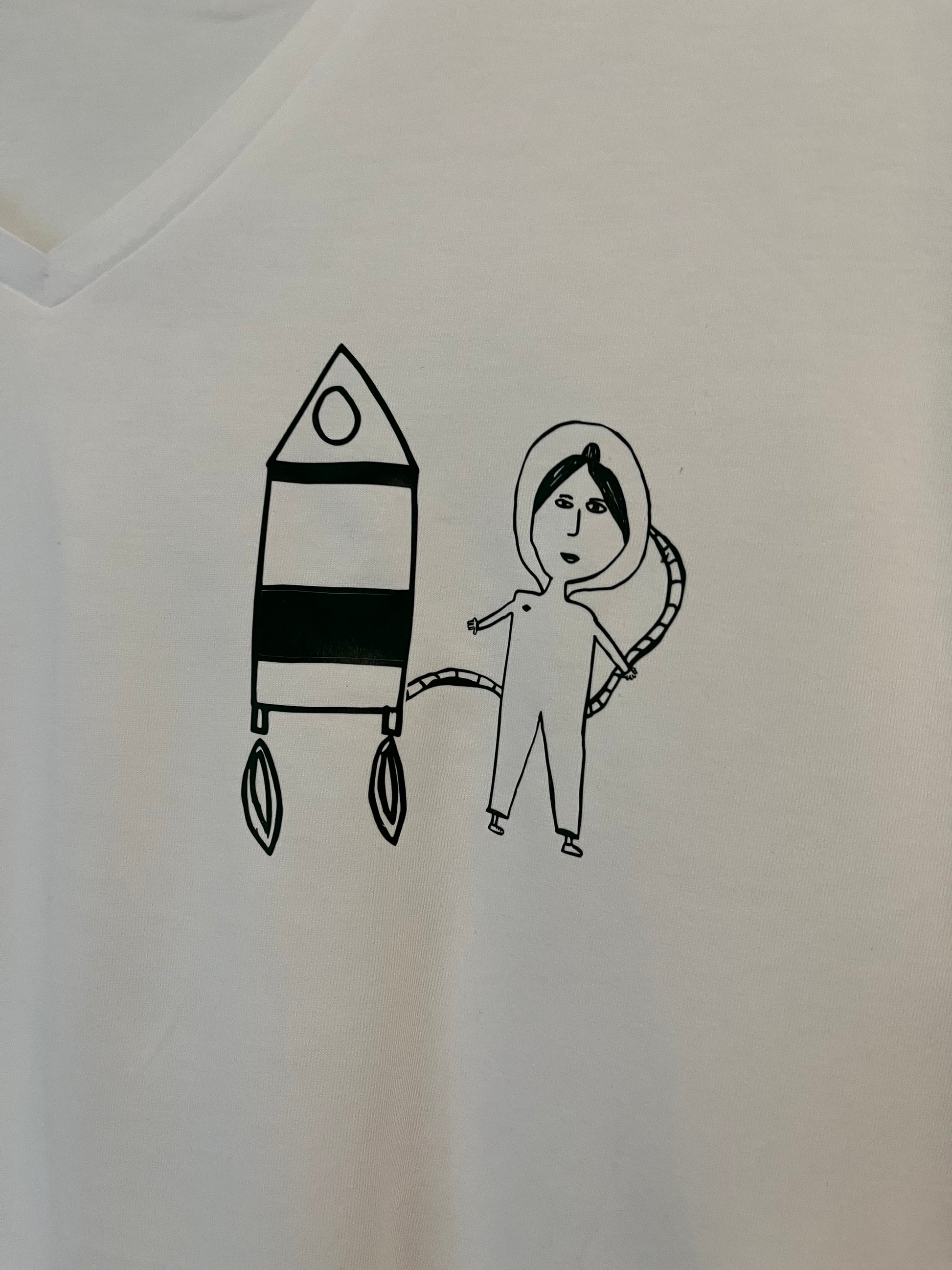 Een vrolijke T-shirt met een raket en ruimtemeisje in verschillende kleuren met ene ronde hals. Heel mooi en makkelijk te combineren.